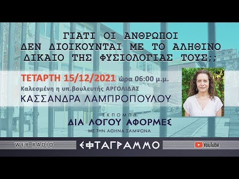 Η ΚΥΡΙΑ ΚΑΣΣΑΝΔΡΑ ΛΑΜΠΡΟΠΟΥΛΟΥΑΝΑΦΕΡΕΙ ΟΤΙ ΓΕΝΙΟΜΑΣΤΕ ΜΕΣΑ ΣΕ ΕΝΑ ΔΙΑΣΤΡΕΒΛΩΜΕΝΟ ΧΩΡΟΧΡΟΝΙΚΟ ΓΙΓΝΕΣΘΑΙ ΟΠΟΥ ΕΠΙΤΡΕΠΟΥΜΕ ΝΑ ΜΑΣ ΔΙΟΙΚΟΥΝ ΜΕ ΕΝΑ ΑΠΟΚΟΣΜΟ ΔΙΚΑΙΟ ΞΕΝΟ ΠΡΟΣ ΤΙΣ ΑΝΑΓΚΕΣ ΤΗΣ ΦΥΣΙΟΛΟΓΙΑΣ ΜΑΣ. ΜΑΣ ΕΧΟΥΝ ΜΑΘΕΙ ΝΑ ΜΗΝ ΑΝΑΓΝΩΡΙΖΟΥΜΕ ΤΟ ΑΛΗΘΙΝΟ ΔΙΚΑΙΟ ΤΩΝ ΑΝΘΡΩΠΩΝ ΚΑΙ ΟΛΩΝ ΤΩΝ ΕΜΒΙΩΝ ΟΝΤΩΝ ΠΟΥ ΕΙΝΑΙ ΑΥΤΟ ΤΟ ΟΠΟΙΟ ΜΑΣ ΕΔΩΣΕ Η ΦΥΣΗ ΩΣΤΕ ΝΑ ΜΗΝ ΑΦΑΝΙΣΘΟΥΝ ΤΑ ΔΗΜΙΟΥΡΓΗΜΑΤΑ ΤΗΣ. ΘΑ ΠΡΕΠΕΙ ΝΑ ΚΑΤΑΝΟΗΣΟΥΜΕ ΤΗΝ ΥΠΑΡΞΗ ΑΥΤΟΥ ΤΟΥ ΔΙΚΑΙΟΥ ΠΡΩΤΑ ΚΑΙ ΣΤΗΝ ΣΥΝΕΧΕΙΑ ΝΑ ΠΡΑΞΟΥΜΕ ΓΙΑ ΤΗΝ ΔΙΑΣΦΑΛΙΣΗ ΤΟΥ ΔΙΑΣΦΑΛΙΖΟΝΤΑΣ ΕΤΣΙ ΤΗΝ ΥΓΕΙΑ ΜΑΣ.